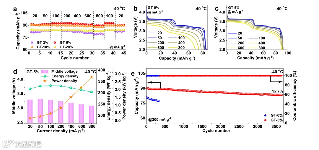 在-40℃下,使用5% THF(GT-5%)的电解液的Na||NMNO-CNTs电池展现出优异的倍率性能和循环稳定性,即使在800 mA g-1的高电流密度下,也保持高的能量密度和功率密度。在3600次循环后,含有GT-5%电解液的Na||NMNO-CNTs电池仍保持83.4 mAh g-1的可逆容量、92.7%的高容量保持率。