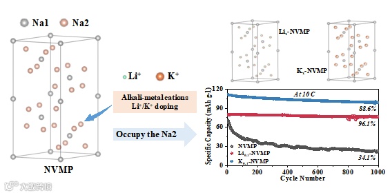 图1. 碱金属阳离子Li⁺/K⁺掺杂占据Na2位点,调控Na4VMn(PO4)3晶体结构,抑制Jahn-Teller效应与晶格应力,显著提升钠离子电池的高倍率性能与长循环稳定性。