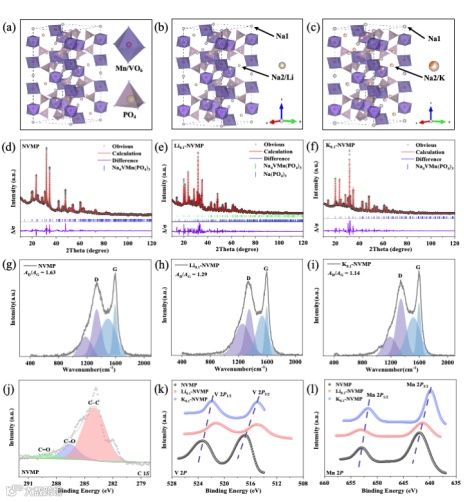 图2. 未掺杂、Li⁺掺杂和K⁺掺杂NVMP的结构模型、XRD精修图、拉曼光谱及XPS谱图,揭示了晶格结构与元素化学状态的变化。