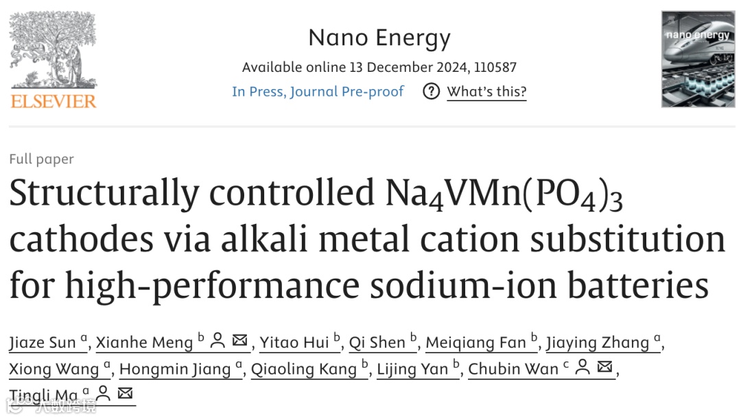 通过碱金属阳离子替代调控Na₄VMn(PO₄)₃结构,实现高性能钠离子电池正极材料