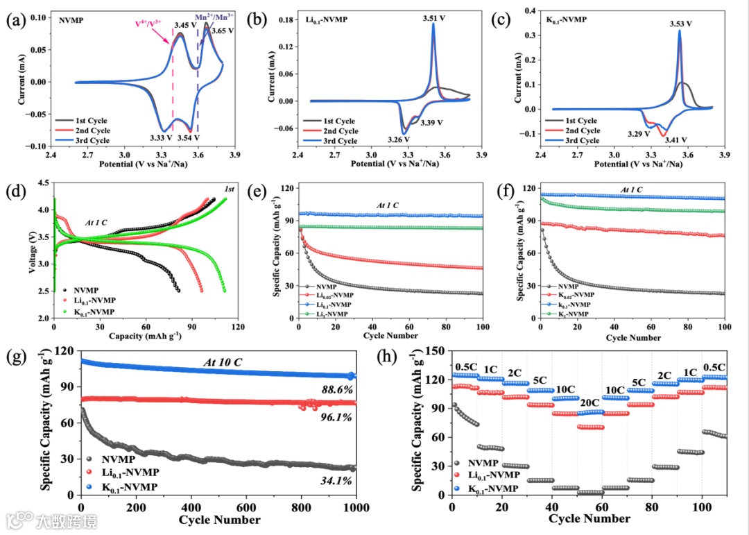 图3. NVMP及不同Li⁺/K⁺掺杂样品的电化学性能,包括CV曲线、首次充放电行为、循环稳定性及倍率性能,显示NVMP在掺杂后具有更优异的容量保持率和倍率性能。