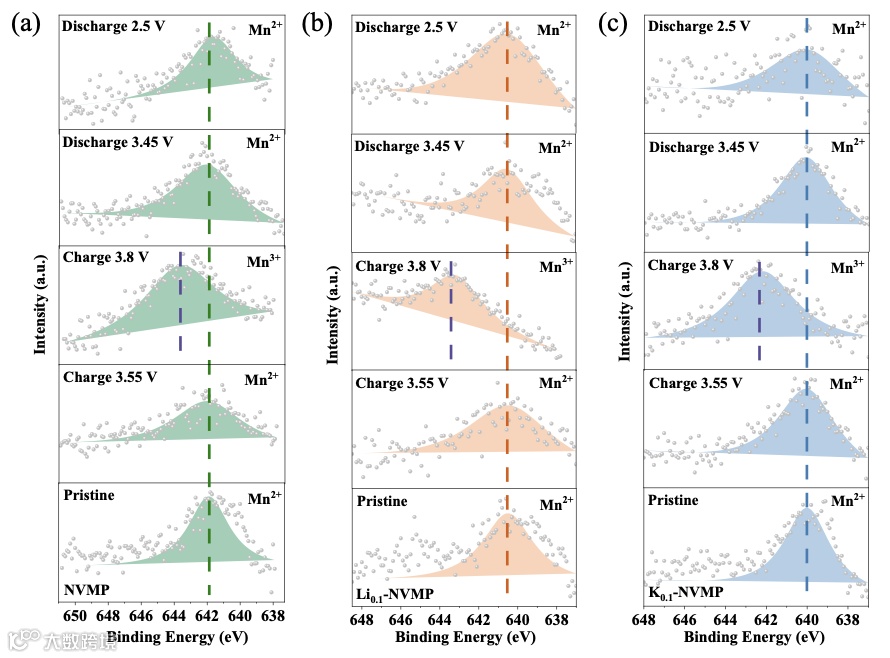 图4. NVMP、Li0.1-NVMP和K0.1-NVMP在不同充放电状态下的Mn 2P3/2 XPS谱图,揭示掺杂对Mn氧化态变化及Jahn-Teller效应抑制的影响。