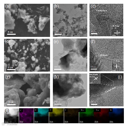 透射电子显微镜(TEM)分析证实了掺杂后的样品晶格结构更为均匀,颗粒表面包覆有均匀的碳层,有效提高了导电性。此外,能量色散X射线光谱(EDS)进一步证实了Li⁺和K⁺元素在材料中的均匀分布。这些结构和成分的优化共同增强了NVMP的电子传输和离子扩散能力,从而实现了卓越的电化学性能。