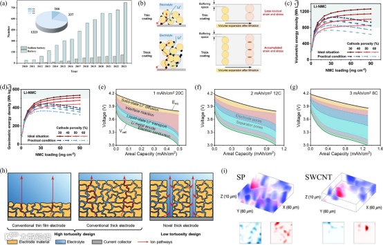 在高能量/功率输出电池方面,具有高活性物质负载的厚电极设计由于能最大限度地减少非活性物质比而被认为是高能量/功率输出电池的一种有效解决方案。然而,由于电荷输运的限制和厚电极机械强度的恶化,导致电极在循环充放电过程中产生更多的裂纹和脱落。多孔结构应用于高负载厚电极中,可以通过控制电极孔隙率改善上述问题。除了孔隙率外,多孔结构的弯曲度也是改善厚电极动力学的重要因素。由于存在开放和相互连接的孔隙,减少了钠离子通过孔隙周围电活性材料薄壁的运输途径,从而使弯曲度最小化。