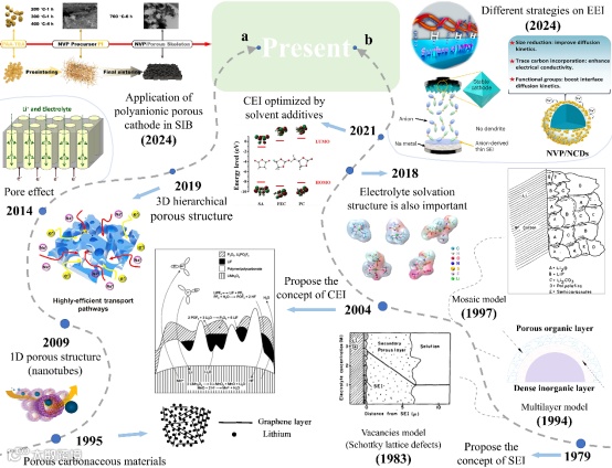 自1979年关于SEI概念的报道以来,由于意识到除电极材料和电解液外,电极与电解液界面存在的化学、热力学行为对电化学性能也有重要影响,近年来关于固液界面逐渐成为研究热点。而多孔结构电极自20世纪末以来受到了广泛的关注。无论是从最初作为负极的多孔碳基材料,如硬碳(HC)和石墨碳,到通过碳涂层技术实现的复合多孔正极材料。从一维多孔纳米管到三维分层多孔结构,大量的研究足以说明多孔结构的优势。