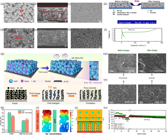 预钠化添加剂可以弥补钠离子电池在首次充放电过程中不可避免的容量损失,提供额外的钠离子,补偿首次循环中的损失,并提升初始库仑效率。其分解产物在电极表面形成一层致密的CEI膜,从而防止电解液分解和过渡金属溶解。此外,预钠化添加剂不可避免的一个问题是产气。预钠化添加剂通常在氧化分解过程中析出气体(H2、O2、CO、CO2或N2),而产生的气体在电极内形成孔洞,增强离子传输。初始循环后,预钠化电极表面出现的孔隙为离子提供了运输通道,有助于提高倍率性能。然而,随着预钠化添加剂用量的增加,在电极表面产生更多的孔隙。过多的孔隙可能会破坏电极表面的结构,从而降低电化学性能。