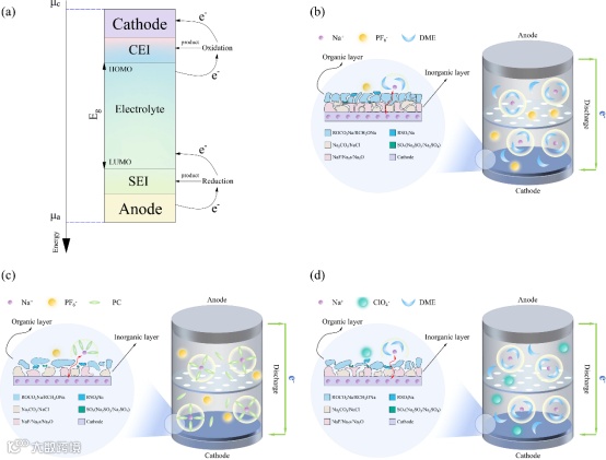 根据分子轨道理论,当正极的费米能(µc)低于电解液的最高已占据分子轨道(HOMO)时,电子会自发地从电解液转移到正极,导致电解液失去电子而氧化。同样,当负极的费米能(µa)高于电解液的最低未占据分子轨道(LUMO)时,电子会自发地从负极转移到电解液中,导致电解液的还原性分解。相关分解产物以不溶物的形式沉淀在电极表面,形成钝化界面层,并作为离子传导的固体电解质层。界面层主要由无机层和有机层组成,有机层在外侧延伸到电解液中,无机层在内侧与电极材料相连。无机层组分一般都是电解液氧化还原过程中的无机产物,如Na2CO3、NaOH、NaO2、NaF、NaCl、Na2S、Na2SO4等。而有机层的建立是通过有机物的沉积,如ROCO2Na(其中R代表有机基团)在无机层上的沉积。这种情况随着薄膜厚度的增加而发生,导致电子转移受阻。此外,不同溶剂化结构的电解液对形成致密的CEI/SEI层也有重要的影响。