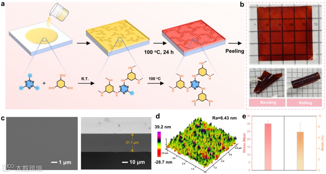 以具有高反应活性的三聚氯氰(CC)和高化学稳定性的2,4,6-三(4-氨基苯基)-1,3,5-三嗪(TAPT)作为单体,通过基于亲核取代反应的原位聚合法,成功制备了自支撑TAPT-CC膜。该自支撑COP膜具有良好的柔韧性和机械强度。
