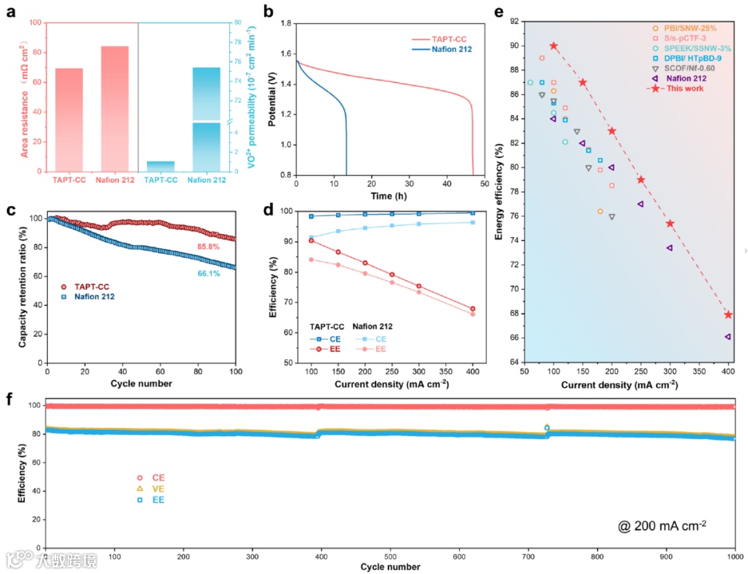 全钒液流电池测试结果表明,采用TAPT-CC膜的电池的自放电寿命远高于采用Nafion 212膜的电池,证明TAPT-CC膜可有效减轻钒离子的交叉。此外,得益于优异的选择性和稳定性,配备TAPT-CC膜的电池在100次循环中的放电容量保持率为85.8%。之后,在200和400 mA cm-2的电流密度下进行长循环测试以评估自支撑TAPT-CC膜在全钒液流电池中的耐久性。结果表明,电池效率在1000次循环后保持稳定。这项研究为先进离子筛膜的设计和制备提供了新的灵感,这对于可持续能源应用的发展至关重要。