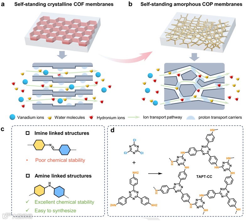 最近,清华大学王保国教授团队通过简单高效的原位聚合法,制备了由不可逆仲胺键连接的自支撑共价有机聚合物(COP)膜。这种自支撑COP膜的无序网络结构使其具有超微孔通道,促进了“离子筛”效应,实现了水合氢离子和钒离子的高效筛分;此外,这种COP膜具有优异的化学稳定性,使其能够承受全钒液流电池苛刻的化学环境,在全钒液流电池中表现出优异的选择性和稳定性。
