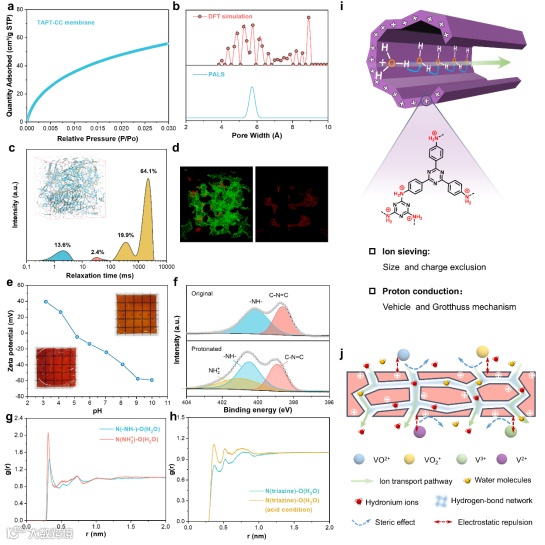 此外,自支撑TAPT-CC膜在酸性溶液中观察到了明显的质子化现象:将膜浸入酸中时,膜从橙色变为红色。不同pH下的Zeta电位结果表明,在酸性条件下,TAPT-CC膜带正电荷,这是质子化的结果。XPS和FT-IR表明,TAPT-CC的质子化位点位于仲胺基团。这种性质使TAPT-CC膜能够通过Donnan效应排斥钒离子。结合其超微孔的离子筛分效应,可以实现高离子选择性。MD计算表明,TAPT-CC膜内存在广泛的氢键网络,从而促进了质子通过Grotthuss机制传输。