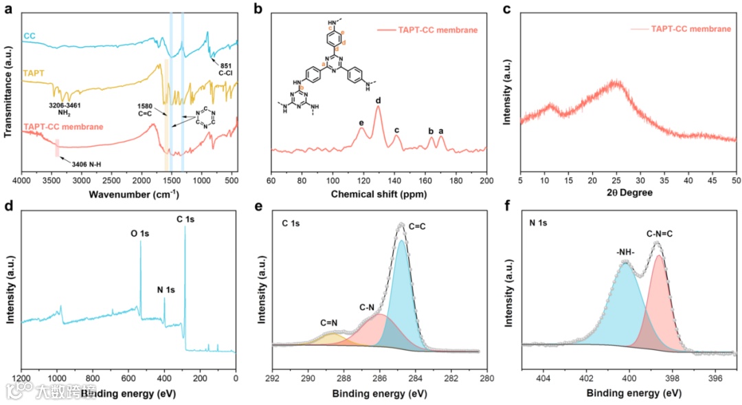 通过FT-IR、XPS、13C CP-MAS ssNMR、XRD等表征阐明了自支撑TAPT-CC膜的化学结构和非晶特性。