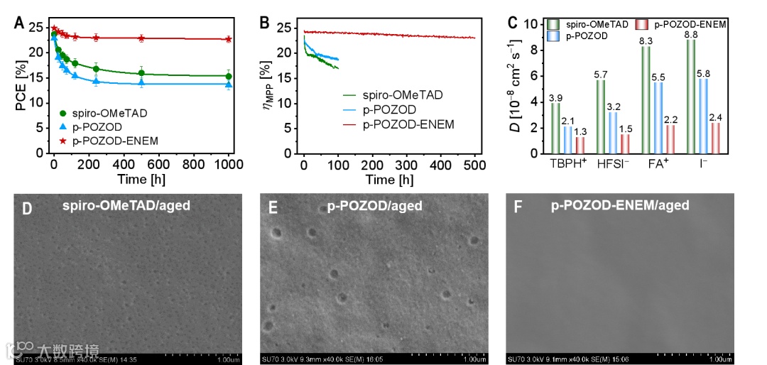 图4.(A)钛矿太阳能电池的能量转换效率(PCE)随85 °C老化时间的演变。(B)AM1.5G条件下最大功率点追踪(MPPT),电池的能量转换效率(ηMPP)随时间的演变。(C)45 oC下外源物种在空穴输运层中的理论扩散系数(D)。(D-F)老化电池的空穴输运层的扫描电子显微镜照片:(D)spiro-OMeTAD;(E)p-POZOD;(F)p-POZOD-ENEM。比例尺:1μm。成像前,去除封装材料和金电极。