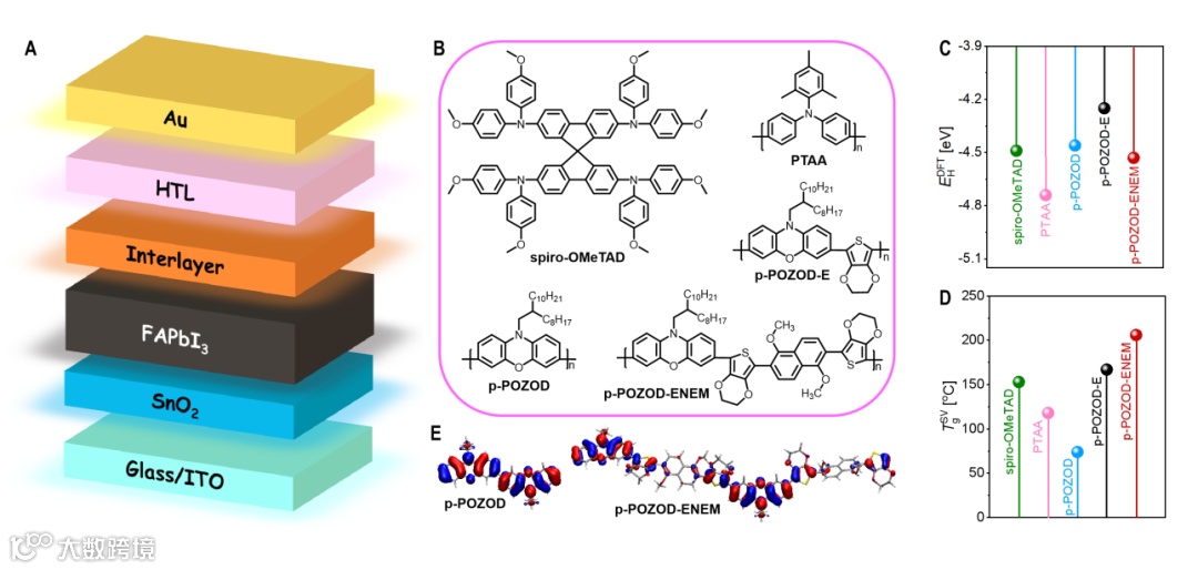 图1.(A)n-i-p钙钛矿太阳能电池的结构示意图。(B)有机半导体的化学结构。(C)理论HOMO能级(EDFTH)。(D)理论玻璃化温度(TSVG)。(E)POZ基聚合物半导体的HOMO等高线图。