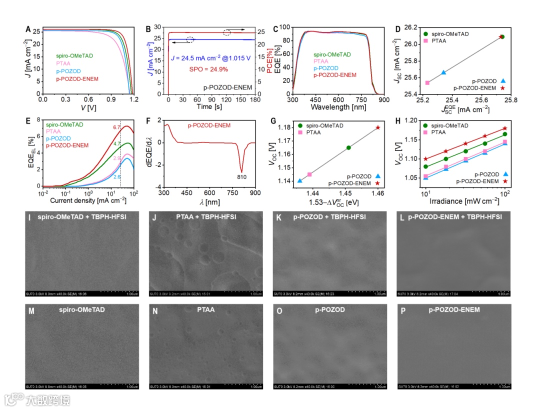 p-POZOD-ENEM作为空穴输运层的电池实现了高达25.0%的能量转换效率,高于spiro-OMeTAD(23.8%)、PTAA(20.5%)和p-POZOD(23.1%)(图3A)。根据电池的电致发光外量子效率(EQEEL,图3E),求得不同电池通过非辐射引起的VOC损失(ΔVnrOC),p-POZOD-ENEM的最低,仅为70 mV,这解释了p-POZOD-ENEM电池最高的VOC(图3G)。此外,我们根据VOC-辐照度的半对数关系(图3H),求得理想因子(n),p-POZOD-ENEM电池的n最小,为1.35。n反映了电池中非线性电荷复合反应级数的倒数。扫描电子显微镜成像表明,spiro-OMeTAD、PTAA和p-POZOD复合薄膜表面都存在不同类型的缺陷(图3I-K)。相比而言,基于p-POZOD-ENEM复合薄膜非常均匀完整(图3L)。均匀完整的空穴输运层可以避免金电极与钙钛矿之间的微纳尺度接触,减少新的电荷复合通道,带来器件性能提升。