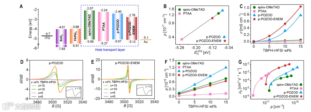 图2.(A)n-i-p钙钛矿太阳能电池中各功能层的能级排列图。(B)有机半导体空穴浓度(p)与紫外光电子能谱测得的HOMO能级(EUPSH)的关系。(C)有机半导体薄膜电导率(σ)随TBPH-HFSI重量百分比(wt %)的变化。(D, E)POZ基聚合物半导体薄膜的电子顺磁共振信号随wt %的变化。(F)p随wt %的变化。(G)空穴迁移率(μp)随p的变化。