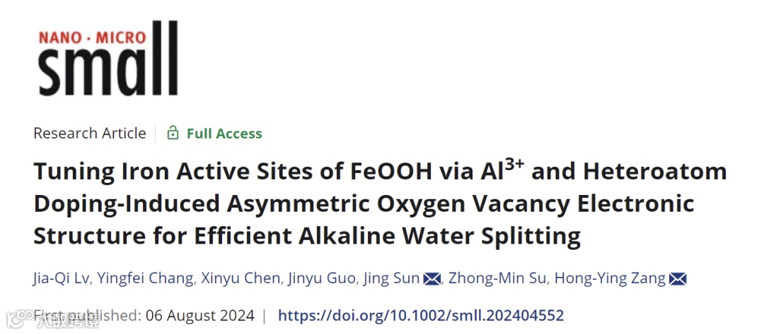 近日,长春理工大学孙晶教授和东北师范大学臧宏瑛教授,在国际知名期刊Small上发表题为“Tuning Iron Active Sites of FeOOH via Al3+ and Heteroatom Doping-Induced Asymmetric Oxygen Vacancy Electronic Structure for Efficient Alkaline Water Splitting”的文章。该研究文章主要通过铝离子和杂原子的掺杂作用实现对FeOOH的微观电子结构的调控,并研究了这种调控引发的电子结构改变对实际碱性全水解性能的影响规律。