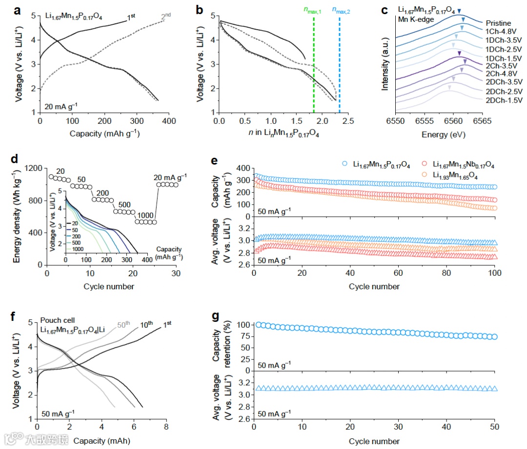 图3d展示了Li1.67Mn1.5P0.17O4材料在不同倍率下的放电性能。随着放电倍率从20 mA g–1增加至1000 mA g–1,材料的容量保持率依然较高,这表明该材料在高倍率下仍然具有良好的电化学活性和稳定性,在高功率应用中也有适用前景。图3e进一步将Li1.67Mn1.5P0.17O4与无聚阴离子的对比样品(如Li1.67Mn1.5P0.17O4和Li1.93Mn1.65O4)的循环稳定性进行了比较。测试结果显示,Li1.67Mn1.5P0.17O4在100次循环后依然保持了72%的初始容量,而对比样品的容量保持率分别为45%和27%。这一对比结果表明,聚阴离子PO4基团的引入显著增强了材料的循环稳定性,使其在长时间高电压循环条件下能够保持较高的容量和能量密度。图3f,g展示了Li1.67Mn1.5P0.17O4在软包电池中优异的循环性能。
