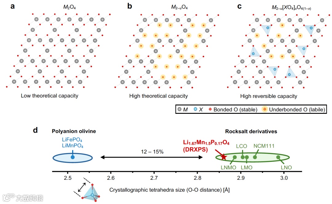 图1展示了富锂岩盐-聚阴离子集成正极(DRXPS)的结构设计理念。首先,图1a展示了常规的M2O4(M为过渡金属)岩盐结构(例如钴酸锂、三元、锰酸锂正极),这种结构中M占据了一半八面体位点。所有氧离子都有三个M离子近邻(O-3M),其结构相对稳定(氧2p轨道与M 3d轨道的杂化有利于形成稳定的电子结构)。然而,由于缺乏额外的阳离子空间来嵌锂,其容量受到限制。图1b展示了阳离子欠缺的岩盐结构,这种结构通过减少部分M阳离子的占位,产生了更多的空位来嵌锂,从而可以达到更高的容量。同时,更多的空位也有利于聚阴离子的引入。然而,由于M占位减少,结构中存在着许多O-2M构型,其氧离子的稳定性较差。在获得高容量的同时,氧离子的氧化还原反应在高电压下被激活,O-2M中的氧离子结合形成氧气被释放,从而造成材料结构的不稳定和电化学性能的衰减。为了解决这一问题,作者在阳离子欠缺的岩盐结构中引入了少量聚阴离子(XO4, X = P, B, Si, S)基团,如图1c所示。通过这种设计,材料中不稳定的氧离子数量得以减少(与X临近的氧离子变为稳定),显著降低了氧气释放的风险,从而增强了材料的结构稳定性和循环寿命。而少量的聚阴离子也不会显著影响材料的容量。