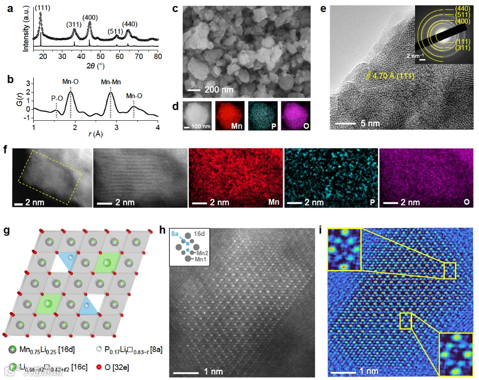图2详细展示了代表性DRXPS成分Li1.67Mn1.5P0.17O4材料的结构和形貌特征。首先,图2a显示了该材料的高分辨率X射线衍射(HRXRD)图谱,证明了其为单相尖晶石结构(岩盐结构的一种)。Rietveld精修结果进一步确认了材料的晶格常数为8.1527 Å,与其他常见的尖晶石结构材料如LiMn2O4和LiNi0.5Mn1.5O4相比稍小,这表明引入的磷酸根(PO4)对材料晶格产生了压缩效应。图2b展示了该材料的配对分布函数(PDF)分析,通过PDF分析,可以观察到材料中的P–O和Mn–O原子对的距离。这些距离与传统的磷酸铁锂LiFePO4和锰酸锂LiMn2O4相比略有不同,与磷酸根的引入导致的晶格应变效应一致(参考图1d)。这些证据表明了聚阴离子和岩盐结构的有效结合。