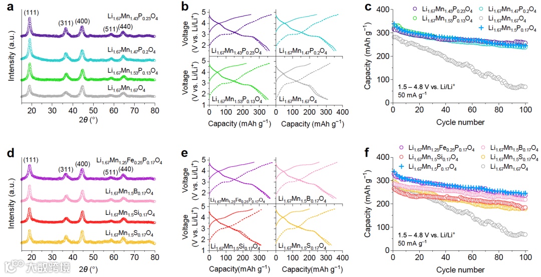 图4展示了DRXPS系列中几种表现较为优异的成分的X射线衍射(XRD)图谱及电化学性能,进一步说明了该系列材料的成分多样性。首先,图4a,d展示了不同成分的DRXPS材料的XRD图谱。其中图4a中的材料具有不同的Mn和P的比例,图4d中的材料引入了铁代替部分锰,以及具有不同的聚阴离子种类。XRD图谱表明,这些材料均形成了单相尖晶石结构,显示出DRXPS系列良好的结晶性和相纯度。
