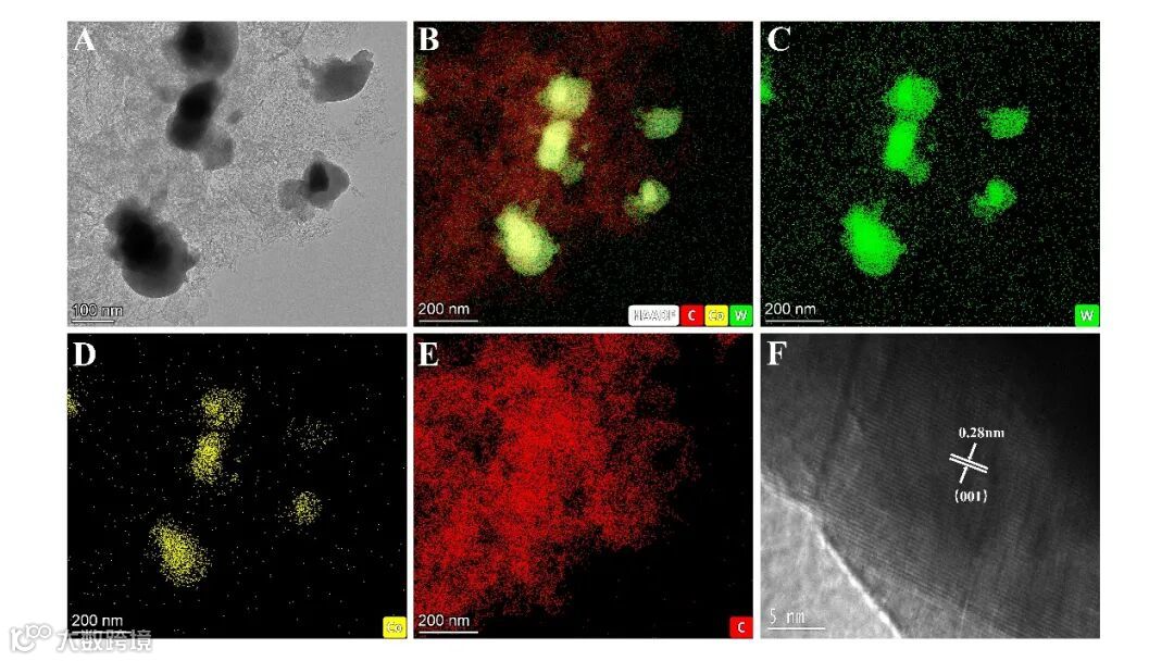图3.Co0.05W0.95C的透射电镜图 (A);Co0.05W0.95C的高分辨扫描电镜图(B);W原子分布图(C);Co原子分布图(D);C原子分布图(E);(001)面的面间距 (F).