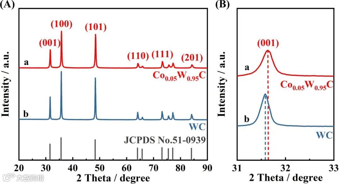 图2. WC及Co0.05W0.95C的XRD衍射图(A);(B)图显示Co0.05W0.95C的衍射角变大,其晶胞缩小了。