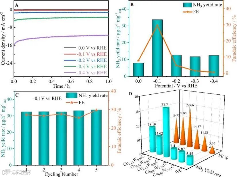 图5.Co0.05W0.95C电催化剂在电位范围 0.0 to -0.4 V vs RHE的计时电流曲线(A);氨在不同电位下的产率及法拉第电流效率(B);Co0.05W0.95C电极在 -0.10 V vs RHE时循环5次的产率及法拉第电流效率(C);在-0.1V时钴在不同掺杂浓度下氨的产率及法拉第电流效率(D)。