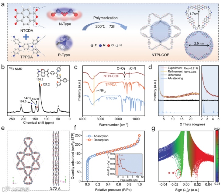 共价有机骨架(COFs)是一类具有周期性阵列结构、化学稳定性高、基本不溶于水溶液的晶体骨架材料。此外,其高比表面积和丰富的多孔结构使COFs具有快速离子传输能力。特别是具有可调亚胺自由基的COFs,由于亚胺基团中孤对电子的存在提高了其电化学活性,逐渐受到人们的关注。常见的聚酰亚胺类COF仅具有单一孔径,不能更好地适应双离子的存储,这是由于不同半径的阴离子和阳离子对孔径的选择性。本文合成的NTPI-COF呈分层多孔结构,微孔(1.7 nm)和介孔(2.9 nm)同时存在,有利于离子扩散。