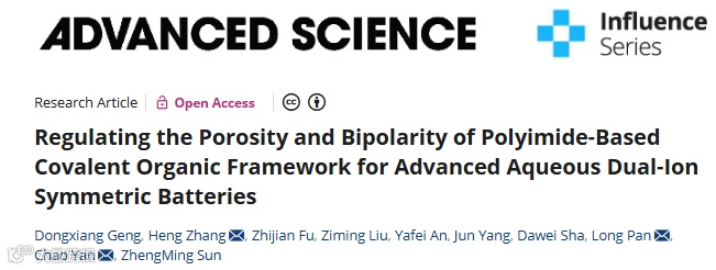 江苏科技大学材料科学与工程学院晏超教授团队采用水热法构建了具有分层多孔结构的NTPI-COF,其同时具有n型和p型官能团,可作双极性电极材料在全有机对称ADIB中使用。得益于稳定的骨架、分层孔隙结构和丰富的氧化还原活性位点,由NTPI-COF组装的全有机对称ADIB在10 A g−1电流密度下,循环10 000圈后,容量保持率依然高达93.2%。此外,对称全有机ADIB的平均工作电压扩展到1.3 V,在2600 W kg−1的功率密度下释放出43 W h kg−1的能量密度。这项工作为设计双极有机电极提供了一个开创性的策略,并有助于先进的全有机ADIBs的发展。该工作以“Regulating the Porosity and Bipolarity of Polyimide-Based Covalent Organic Framework for Advanced Aqueous Dual-Ion Symmetric Batteries”为题发表在《Advanced Science》上(Adv. Sci. 2024, 2407073),论文第一作者江科大材料学院2022级硕士生耿东祥,江科大晏超教授、张恒博士以及东南大学潘龙副研究员为论文的共同通讯作者。