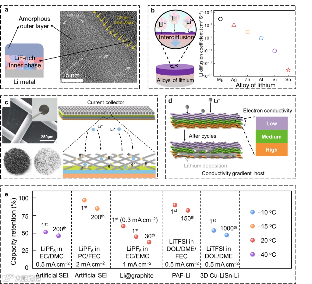 图4. 低温下Li金属电池Li负极的调整策略。(人工SEI、合金化、集流体调整、多层电导率梯度骨架)