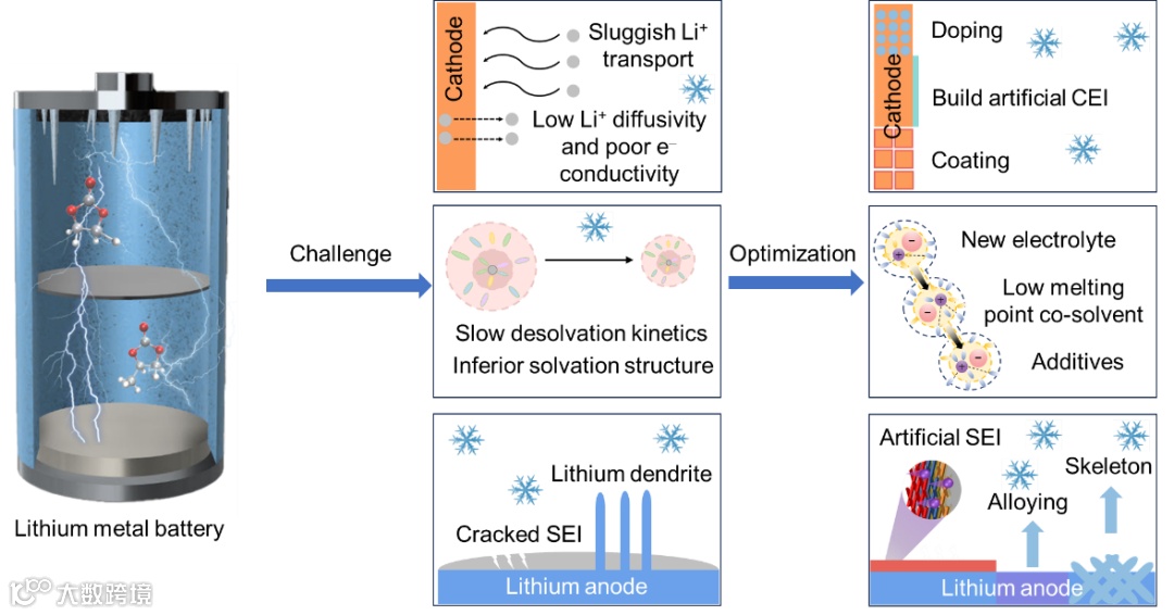 图1. 低温下锂金属电池面临的挑战以及解决策略。