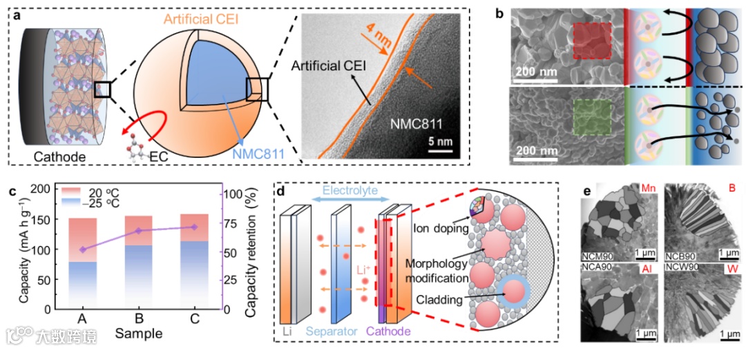 图3. 低温下锂金属电池正极的调整策略。(人工CEI膜、结构优化、离子掺杂、形貌调节)