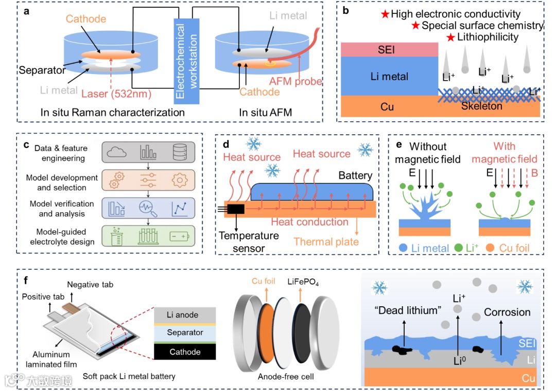 图4. 低温下锂金属电池展望。(先进表征测试技术、低温功能骨架、低温模拟与计算、自加热系统以及外场调控机制、低温软包电池和无负极锂金属电池)
