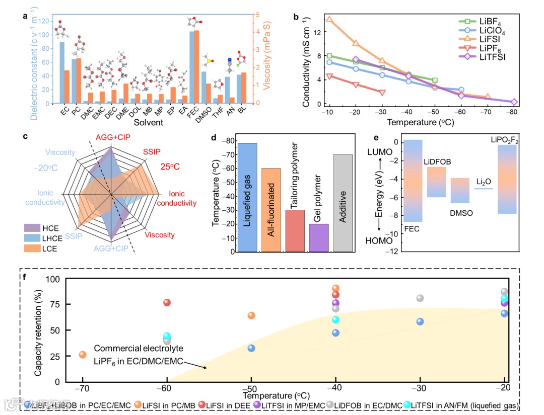 图2. 低温下锂金属电池电解液的配置策略。(溶剂、锂盐种类以及浓度、添加剂、新型电解液)