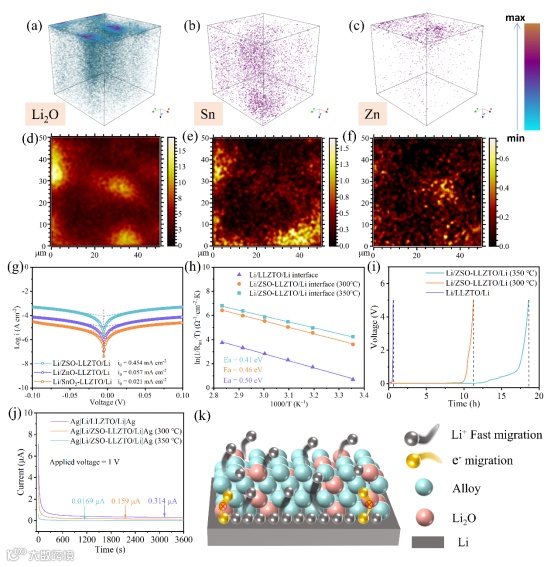 图4. ZSO界面层的TOF-SIMS图:a) Li2O与d)相应的顶视图映射,b) Sn与e)相应的顶视图映射,c) Zn与f)顶视图映射;g) Li/ZSO-LLZTO/Li、Li/ZnO-LLZTO/Li和Li/SnO2-LLZTO/Li对称电池的塔菲尔曲线;Li/LLZTO和Li/ZSO-LLZTO(300℃和350℃)的h)界面活化能;i) 0.2 mA·cm-2下的时间-电压曲线;j) 室温1 V下的恒电位极化曲线;k) 锂离子在混合中间层中的快速迁移示意图。