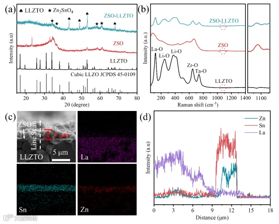 图2. a) ZSO、LLZTO和ZSO-LLZTO的XRD图;b) ZSO、LLZTO和ZSO-LLZTO的拉曼光谱;c) ZSO-LLZTO的截面SEM及EDS;d) 沿图(c)白色箭头方向的元素线型扫描。
