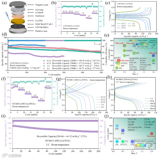 图6. 25 ℃时LFP/ZSO-LLZTO/Li和NCM811/ZSO-LLZTO/Li电池性能:a)电池结构示意图;LFP电池的b)倍率性能,c) 不同倍率下的充电/放电平台曲线,d) LFP/ZSO-LLZTO/Li电池在0.2、0.5、1和2 C下的循环性能,e) LFP/ZSO-LLZTO/Li电池性能与相关文献的对比;NCM811全电池的f)倍率性能,g) 不同倍率下的充电/放电平台曲线,h) ,1、50、100、150和200圈充电/放电的电压曲线;i) ,2 C下的循环性能,j) NCM811/ZSO-LLZTO/Li电池性能与相关文献的对比。