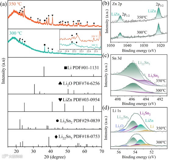 图3. a) 在300°C和350°C下处理30分钟的Li-ZSO反应的XRD;b-d) Li与ZSO反应的XPS光谱:(b) Zn 2p, (C) Sn 3d, (d) Li 1s。