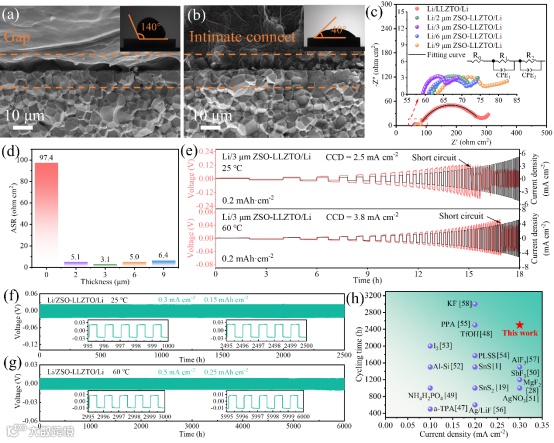 图5. a) Li/LLZTO和b) Li/ZSO-LLZTO界面的截面SEM;c) LLZTO和x μm ZSO-LLZTO(x = 2, 3, 6, 9)锂对称电池的EIS图;d) 25 ℃和60 ℃下Li/3 μm ZSO-LLZTO/Li电池的CCD;e) Li/LLZTO和x μm ZSO-LLZTO界面阻抗的对比图;f,g) Li/ZSO-LLZTO/Li电池在25 °C、电流密度为0.3 mA·cm-2和60°C、电流密度为0.5 mA·cm-2时的恒流循环;h) 该工作与相关文献的对比。