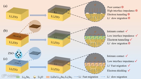 图1. 改性前后Li/LLZTO界面示意图:a) Li/LLZTO, b) Li/SnO2-LLZTO, c) Li/ZSO-LLZTO。