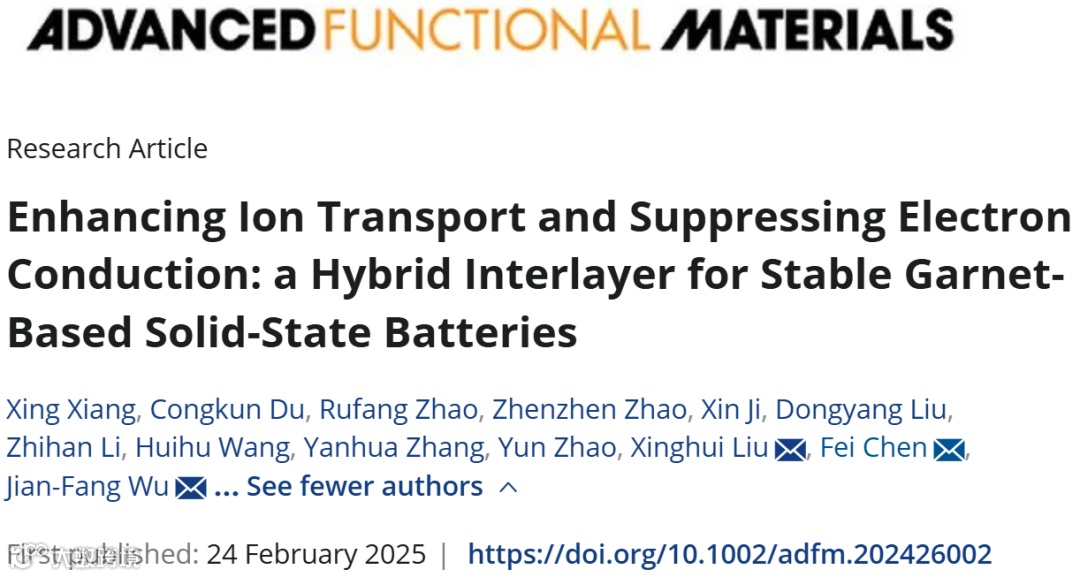 X. Xiang, C. Du, R. Zhao, Z. Zhao, X. Ji, D. Liu, Z. Li, H. Wang, Y. Zhang, Y. Zhao, X. Liu, F. Chen, J.-F. Wu, Enhancing Ion Transport and Suppressing Electron Conduction: A Hybrid Interlayer for Stable Garnet-Based Solid-State Batteries. Adv. Funct. Mater. 2025, 2426002.