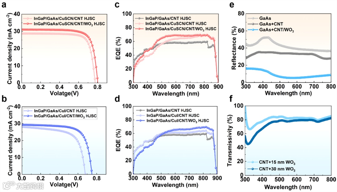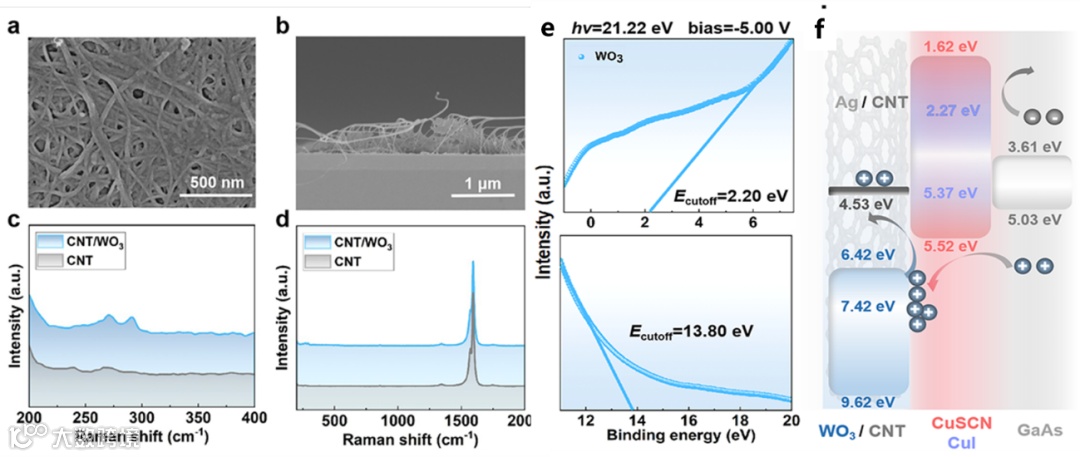 CNT/WO3薄膜的SEM和Raman图如图2a-d所示,从其表面形貌以及翘起部分可看出,通过电子束蒸发制备超薄WO3可有效填充CNT薄膜,同时并不会引入额外的缺陷。众所周知,WO3的导带低于GaAs,因此难以与其直接构筑异质结。基于WO3的UPS光谱,其功函数计算为7.42 eV,而根据其Ecutoff和带隙,EV和EC分别计算为6.42和9.62 eV。GaAs/Cu+/CNT/WO3异质结的能带示意图如图3(f)所示。在GaAs吸收入射光产生光生载流子后,CNT薄膜作为空穴传输载体会将大部分光生空穴导出并传输至Ag正面电极处。在不经过任何界面处理的情况下,光生载流子容易在GaAs/CNT异质界面处复合而损耗掉;在加入Cu+基钝化层后,可大幅提升GaAs处光生电子的跃迁势垒,有效抑制界面处载流子复合并促进载流子快速分离。显然,在光生空穴传导至CNT薄膜中时,仍需面临横向位移的收集过程。WO3的加入,可以在CNT传输路径处形成较高的空穴跃迁势垒,减少光生空穴在CNT薄膜传输过程中的复合,增强Ag电极对空穴的收集效率,从而提升异质结器件光伏性能。