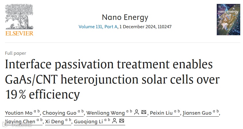 近日,来自华南理工大学的李国强教授、王文樑教授课题组,在国际知名期刊Nano Energy上发表题为“Interface Passivation Treatment Enables GaAs/CNT Heterojunction Solar Cells over 19% Efficiency”的研究文章。该文章提出采用CuSCN和CuI进行界面钝化协同WO3空穴传输层有效提升GaAs/CNT异质结太阳电池光电转换效率分别可达19.06%和15.53%,同时长期工作稳定性能得到明显改善。这一系列研究表明,Cu+基界面钝化层材料在GaAs基异质结中展现出良好的应用前景,为开发低成本、高效稳定的太阳电池器件开发提供了新策略。
