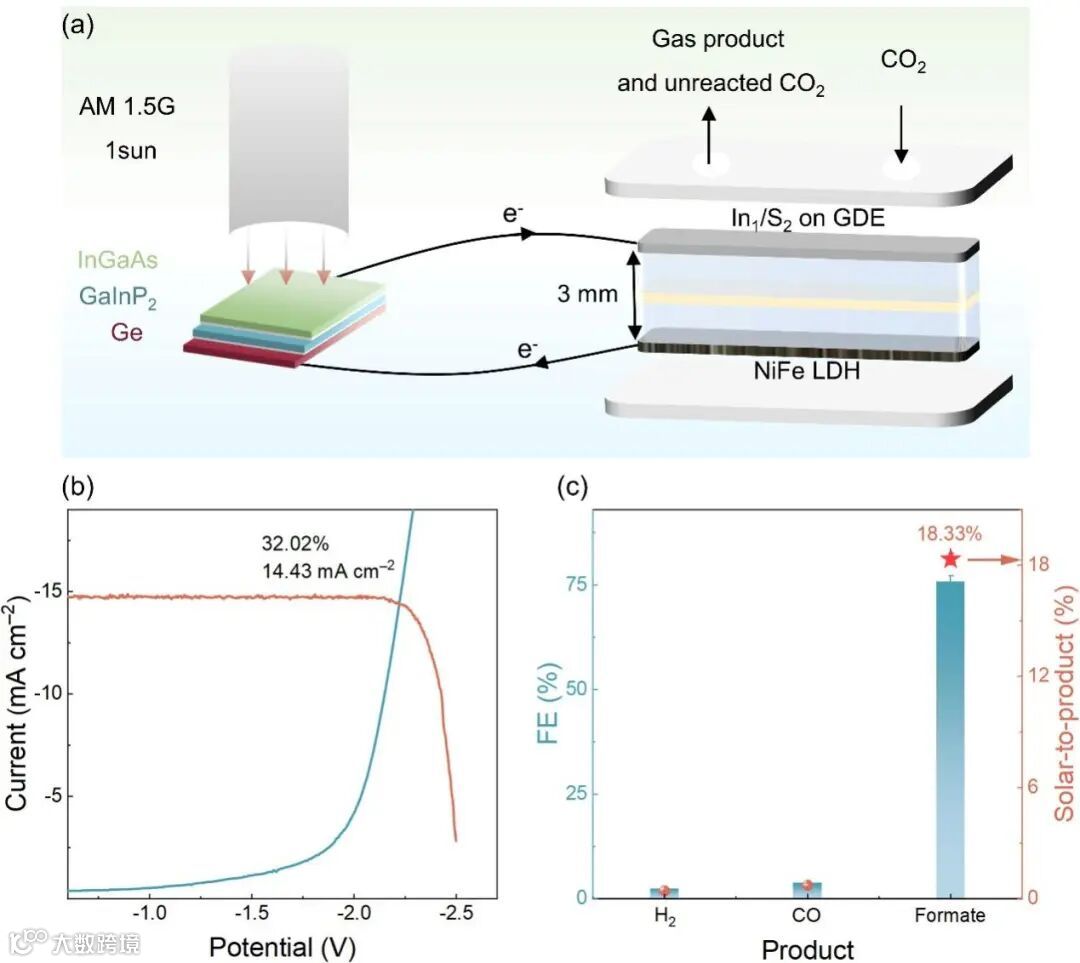 可再生能源驱动的电化学CO2还原被认为是实现该技术大规模应用的重要途径。我们评估了由太阳能驱动产甲酸的潜力。我们通过将基于气体扩散电极的CO2还原反应器与由InGaAs/GaInP2/Ge太阳能电池集成来实现这一目标(图5a)。为了最小化反应器的电阻并提高能量转换效率,反应器中阳极与阴极之间的距离设计为3 mm。阳极使用了非贵金属Ni3.2Fe(OH)9.4(NiFeOx LDH)催化剂,其产氧性能源优于贵金属Pt。在阴极处使用了In1/S2作为CO2还原电极。太阳能电池的面积为1 cm2,最大太阳能到电能的转换效率为32.29%,太阳辐射使用氙灯进行模拟。在1个太阳光照下,反应器与光伏特性交点的电流和电压分别为14.43 mA和2.22 V(图5b)。此时,光到电能的转换效率为32.02%。经过耦合测试,甲酸选择性达到75.83%,太阳能到甲酸的能量转换效率为18.33%(图5c)。此外,整体太阳能到碳氢燃料的能量转换效率达到19.49%。这些结果展示了该装置在高效利用太阳能方面的优势。