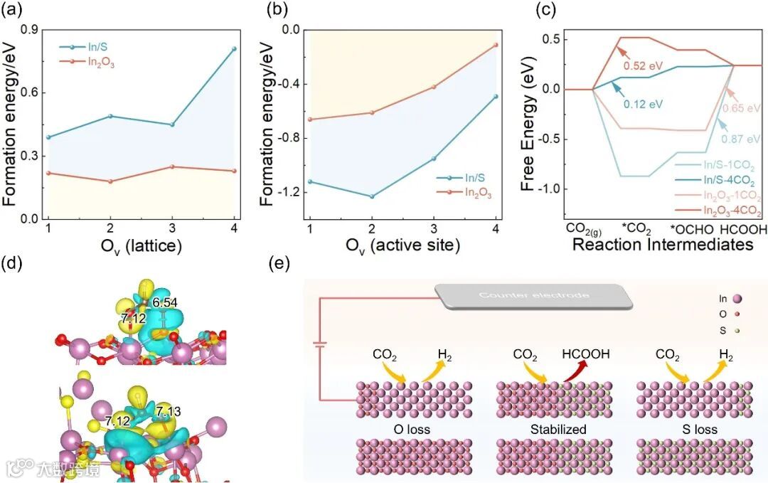 上述电化学测试结果表明,在ECO₂RR过程中,In2O3得到了稳定。因此,我们计算了In2O3上氧的脱附能,因为只有晶格氧空位会导致本征材料的相变和失活。我们发现,In2S3的存在显著增加了In2O3(In/S)中晶格氧空位(Ov)的形成能,且随着脱去氧空位数量的增加,形成能也增加(图4a)。表面氧空位被证明是活性位点(Ov)。值得一提的是,与晶格空位的形成能相比,活性氧空位的形成能显示出相反的趋势(图4b)。In2S3的存在促进了In2O3表面形成更多活性位点,体现在CO2吸附能力的提升。我们计算了不同数量CO2分子在表面的吸附能。尽管在低CO2覆盖度下,纯In2O3的吸附能与In/S几乎相同,但当CO2分子数达到3时,In2O3表面的吸附能为0.34 eV。相比之下,In/S上的吸附过程仍是放热的。这表明In2S3的存在显著增强了表面容纳CO2分子的能力。