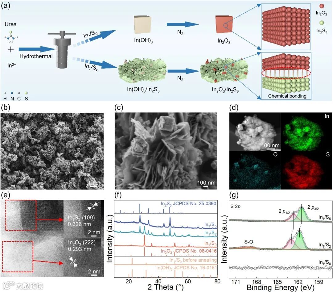 溶剂热法或酸性环境常用来合成纯的In2S3,而In2O3的生成更倾向于使用水热法。因此,为了合成In2O3和In2S3的复合材料,我们选择了水热法(图1a)。在中性条件下将硫源加入到硝酸铟中,以确保In(OH)3的沉淀生成。当未加入硫源时,只生成了立方相的In(OH)3。随着硫源从1/0增加到1/5,出现了一种新的具有杏仁状形态的片状结构,并逐渐增加,该结构为In2S3。与此同时,立方相In(OH)3的量逐渐减少(图1f)。退火后,In(OH)3分解成裂纹In2O3,并负载在In2S3上,且分布均匀(图1b-1e)。由于惰性气体环境,In2S3没有发生相变或形貌变化。价态分析表明,随着硫源逐步增加,S 2p的结合能显示出蓝移(图1g)。重要的是,我们在In1/S2的XPS谱图中观察到S–O键,而在另外两个样品中没有出现。同时,In 3d和O 1s的价态分别显示出红移和蓝移。这些结果表明,引入硫源导致了In2O3与In2S3之间化学键的形成。
