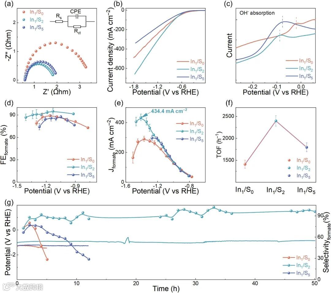 电化学CO2还原反应的测试采用流动反应池,结果表明,随着硫源的增加,甲酸的选择性和部分电流密度在In1/S2时达到峰值。因此,我们重点比较了In1/S0、In1/S2和In1/S5样品的表现。在测试之前,样品通过循环伏安法进行激活,直到获得稳定电流。电化学阻抗谱显示,In1/S2具有更低的电子转移电阻(图2a);随着电位变得更负,In1/S2的电流密度显著加快上升,表明其具有更优越的电化学活性(图2b)。OH–的吸附表明,In1/S2表面OH–的吸附电位低于In1/S0和In1/S5,这表明In1/S2对CO2吸附具有更高的亲和力(图2c)。