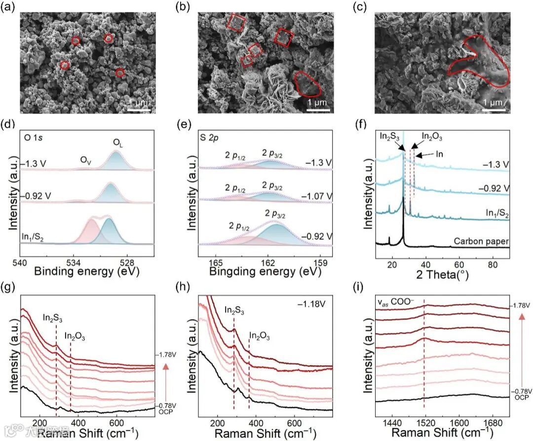 我们对三种催化剂在反应前后的形貌进行了表征,因为材料的相变通常伴随着形貌的变化。如图3a所示,反应后,裂纹In2O3(In1/S0)转变为球形结构,表明In2O3的形貌随着相变发生了变化。类似的情况也发生在In2S3(In1/S5)中,其中层状的In2S3转变为大型曲面结构(图3c)。然而,相变对In2S3(In1/S5)产甲酸影响较大,表现为In2O3(In1/S0)的甲酸选择性和部分电流密度高于In2S3(In1/S5)。In2S3(In1/S5)的稳定性优于In2O3(In1/S0),表现为In2S3(In1/S5)的脱硫速度比In2O3(In1/S0)脱氧慢。而In1/S2表现出明显的裂纹结构和层状结构,特别是在反应后的裂纹结构(图3b)。这些特性使其具有更高的电化学活性、甲酸产量和稳定性。所有三种样品在稳定性测试后显示出类似的形貌变化。基于这些发现,我们可以推测In1/S2中的In2O3可能得到了稳定,这种稳定的In2O3提高了In1/S2产甲酸性能。