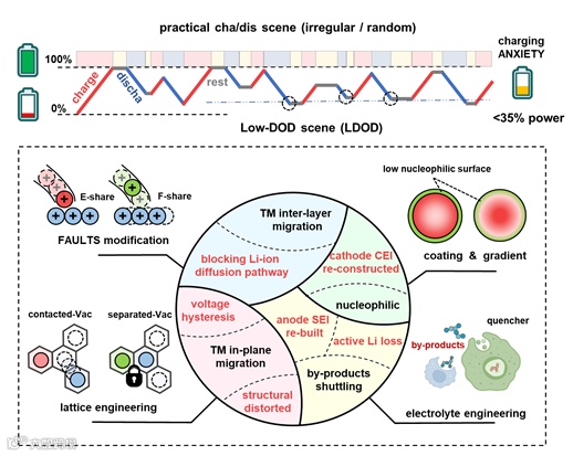 图1. LDOD循环期间 LRLO 的快速容量衰减机制和改性措施。